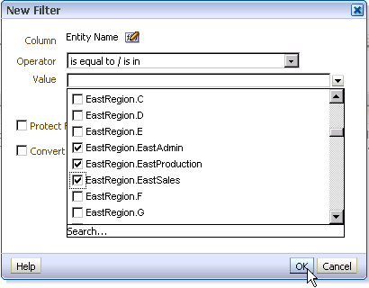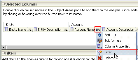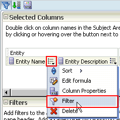 In the Selected Columns pane, click the toolbar icon next to Entity Name, and then click Filter.