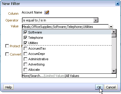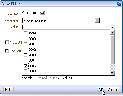 In the Value drop-down list, select 2005, and click OK: Note: The data file that is packaged with the Comma sample application has data in 2005. You can query against that data.