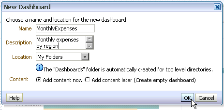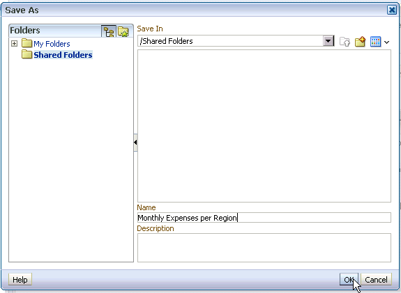 Note: If you save the dashboard in the Dashboards subfolder directly under the /Shared Folders/first level subfolder, the dashboard will be listed in the Dashboard menu on the global header. If you save it in a Dashboards subfolder at any other level (such as /Shared Folders/Sales/Eastern), it will not be listed. If you choose a folder in the Dashboards subfolder directly under the /Shared Folders/first level subfolder in which no dashboards have been saved, a Dashboards folder is automatically created for you.