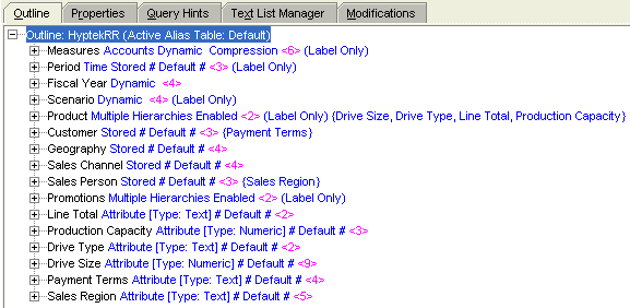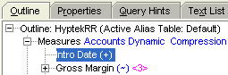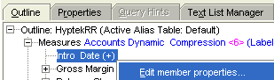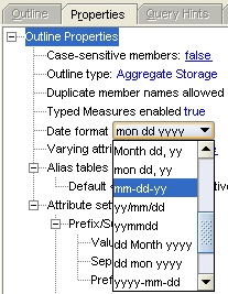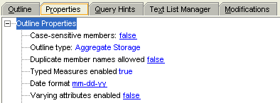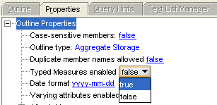 Both text and date measures are typed measures, measures that can be associated with text and date values respectively. Both are enabled in the outline properties, accessed through Outline Editor.