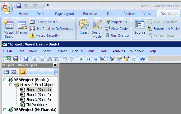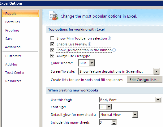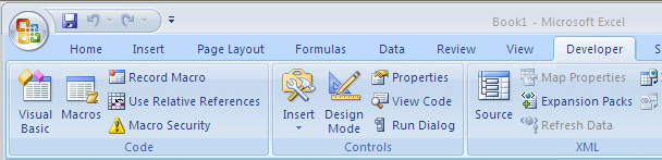 In Excel, click the Office button, select Excel Options, and under Popular, check Show Developer tab in the Ribbon.