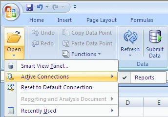 On the Smart View tab, click Open > Active Connections to verify that you are connected to the data source.