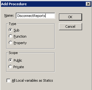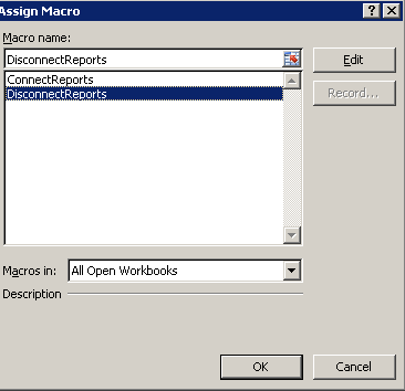 Repeat steps 4, 5, and 6 to create another button and assign the DisconnectReports function to it.