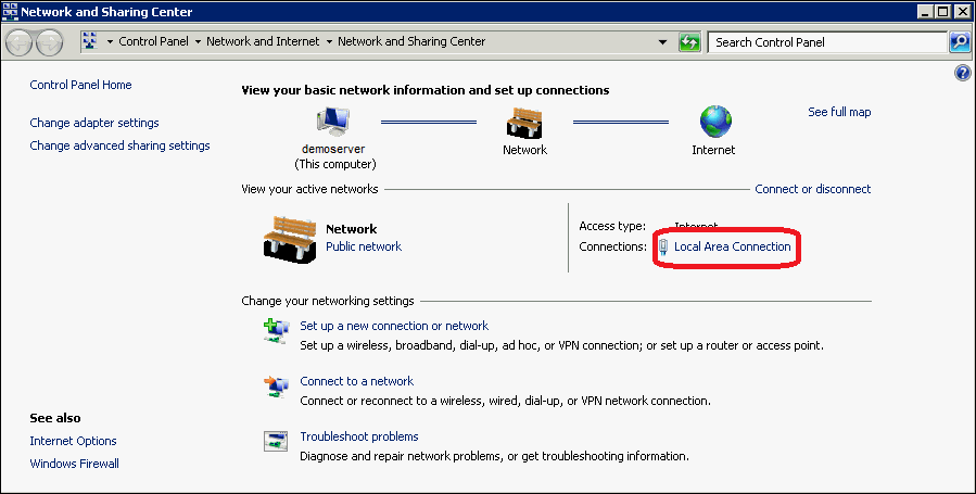 - From Network and Sharing Center screen, click on Local Area Connection.