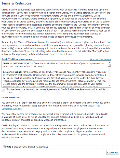 On Terms & Restrictions, read and accept the Trial License and Export Restrictions agreements, and then click Continue.