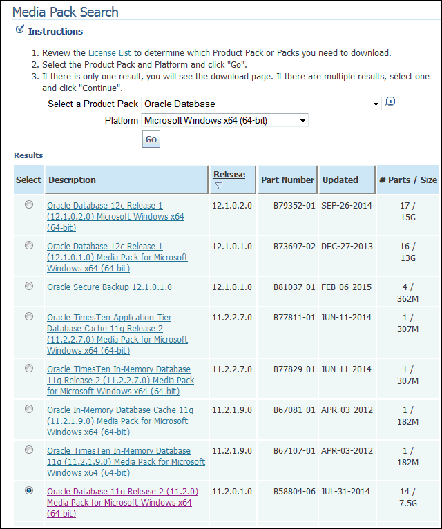In Media Pack Search, search for Oracle Database product pack for Microsoft Windows x64 (64-bit), and then select Go.