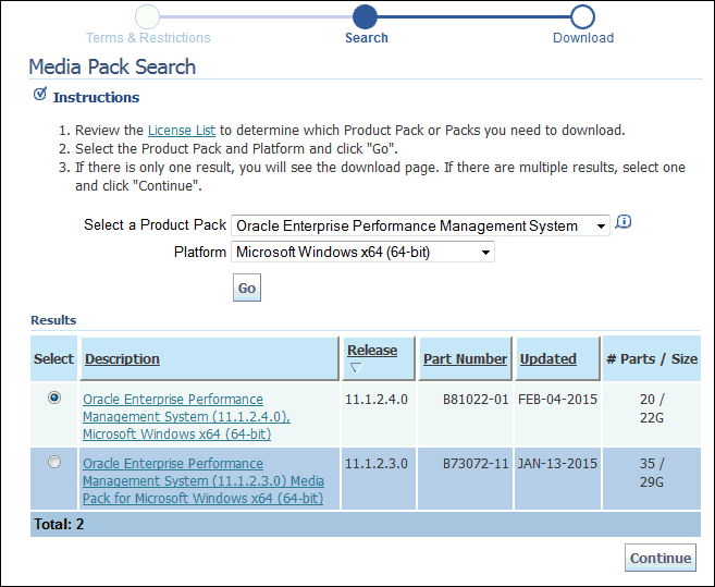In Results, select Oracle Enterprise Performance Management (11.1.2.4.0) Media Pack for Microsoft Windows x64 (64-bit), and then click Continue.