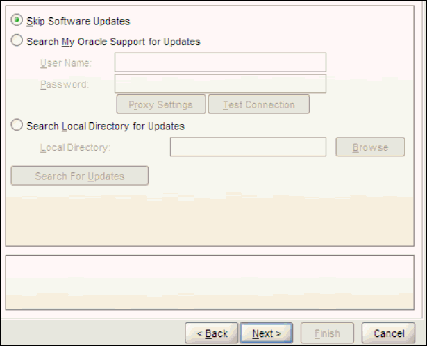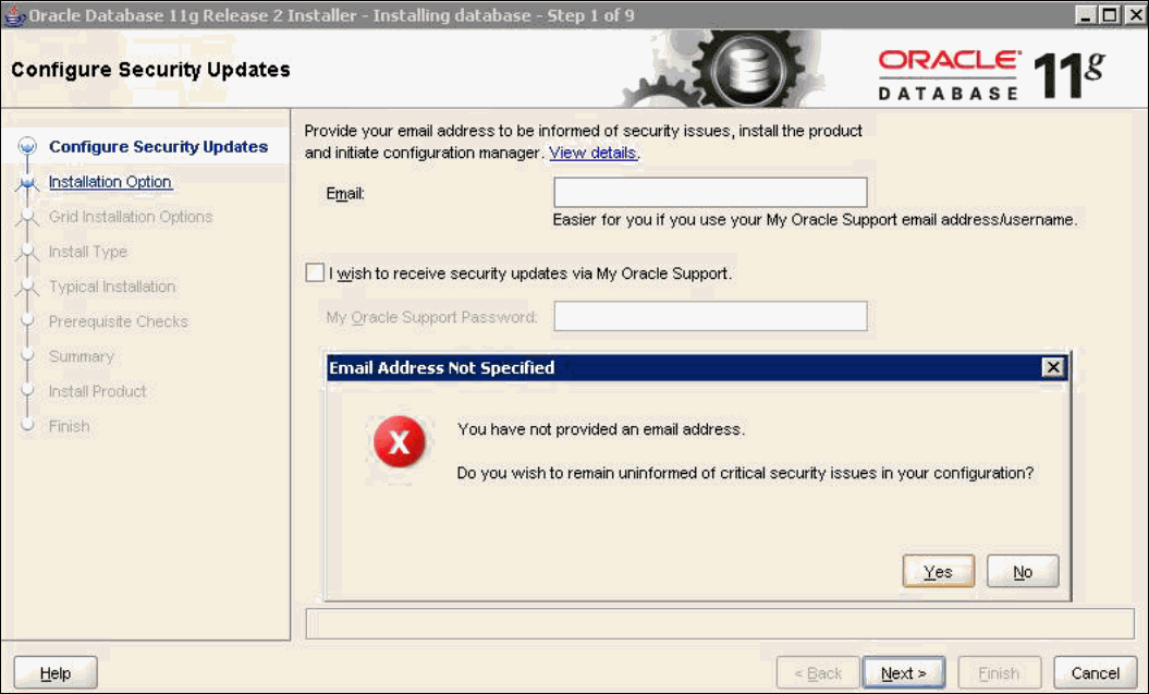In Configure Security Updates, uncheck I wish to receive security updates via My Oracle Support, and then select Next.
