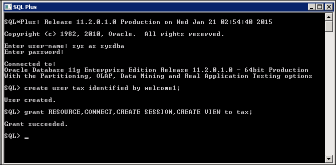 create user tax identified by welcome1; - Grant CONNECT and RESOURCE roles, and CREATE SESSION and CREATE VIEW privileges to tax by entering the following command: