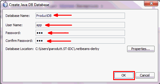 In the Create Java DB Database dialog box, enter the following details and click OK: