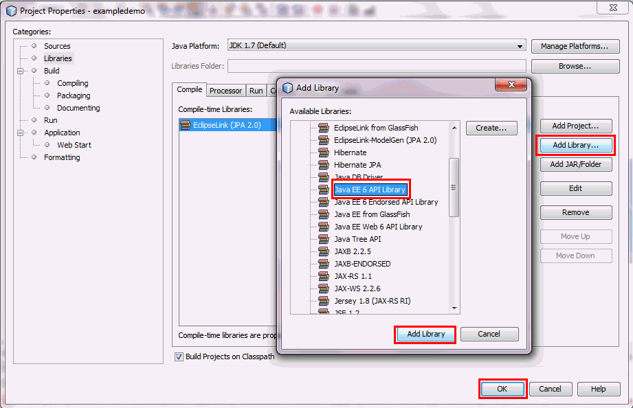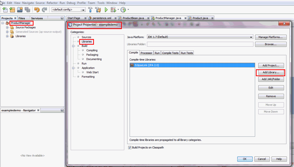 b. At the Project Properties - ProductManager dialog box, select Libraries in the Categories section and click the Add JAR/Folder button