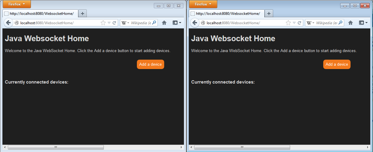 A device is added to the Java WebSocket Home server and it is rendered in both web browsers.