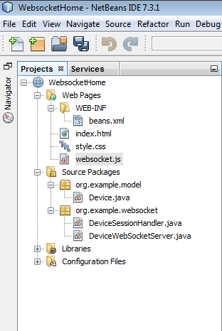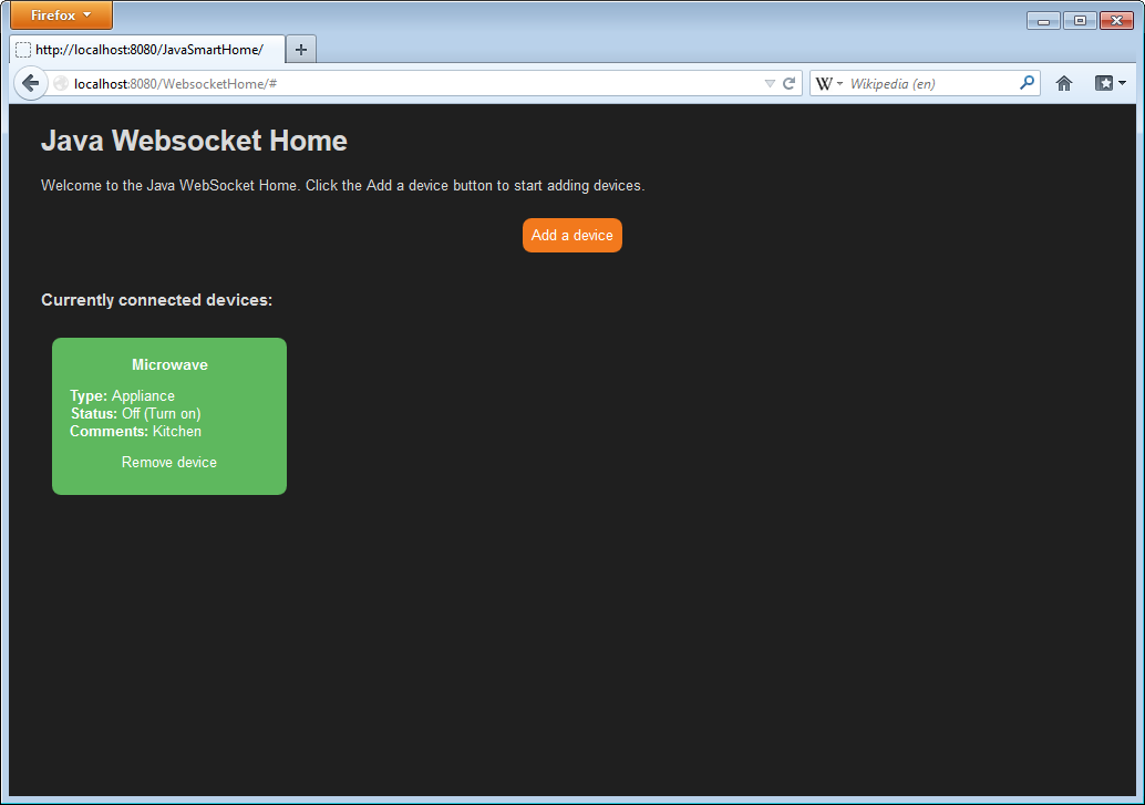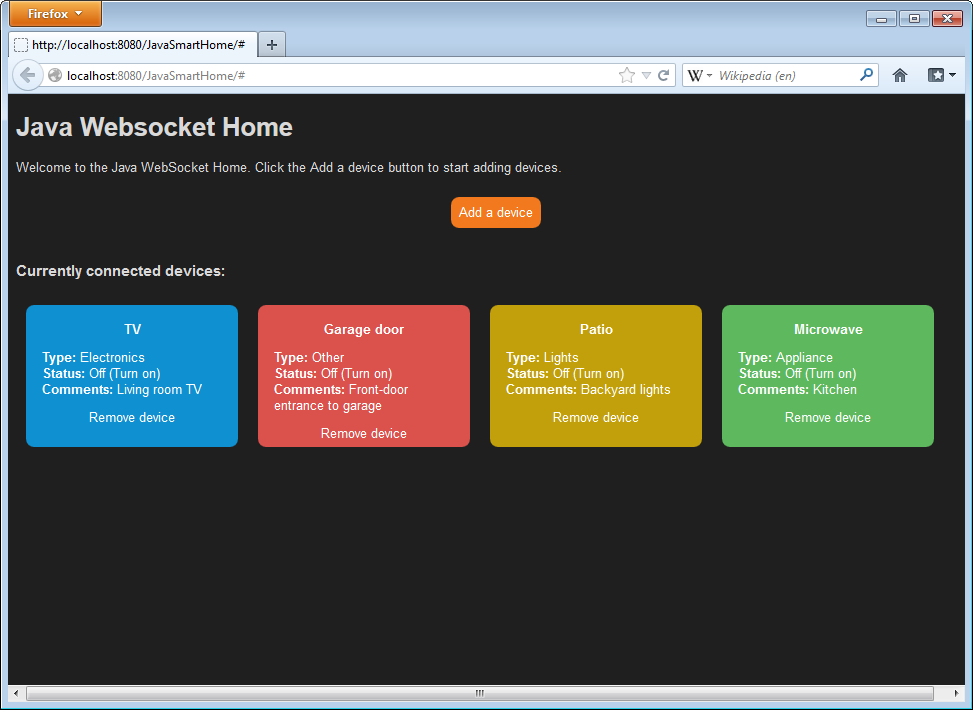 In this tutorial, you create Java WebSocket Home, a smart home control web application based on Java EE 7. Java WebSocket Home has a user interface for connecting and controlling fictitious devices from a web browser to a Java application. This application provides real-time updates to all clients that are connected to the Java WebSocket Home server.