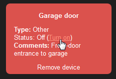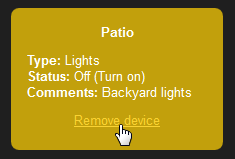 style.cssfile.body { font-family: Arial, Helvetica, sans-serif; font-size: 80%; background-color: #1f1f1f; } #wrapper { width: 960px; margin: auto; text-align: left; color: #d9d9d9; } p { text-align: left; } .button { display: inline; color: #fff; background-color: #f2791d; padding: 8px; margin: auto; border-radius: 8px; -moz-border-radius: 8px; -webkit-border-radius: 8px; box-shadow: none; border: none; } .button:hover { background-color: #ffb15e; } .button a, a:visited, a:hover, a:active { color: #fff; text-decoration: none; } #addDevice { text-align: center; width: 960px; margin: auto; margin-bottom: 10px; } #addDeviceForm { text-align: left; width: 400px; margin: auto; padding: 10px; } #addDeviceForm span { display: block; } #content { margin: auto; width: 960px; } .device { width: 180px; height: 110px; margin: 10px; padding: 16px; color: #fff; vertical-align: top; border-radius: 8px; -moz-border-radius: 8px; -webkit-border-radius: 8px; display: inline-block; } .device.off { background-color: #c8cccf; } .device span { display: block; } .deviceName { text-align: center; font-weight: bold; margin-bottom: 12px; } .removeDevice { margin-top: 12px; text-align: center; } .device.Appliance { background-color: #5eb85e; } .device.Appliance a:hover { color: #a1ed82; } .device.Electronics { background-color: #0f90d1; } .device.Electronics a:hover { color: #4badd1; } .device.Lights { background-color: #c2a00c; } .device.Lights a:hover { color: #fad232; } .device.Other { background-color: #db524d; } .device.Other a:hover { color: #ff907d; } .device a { text-decoration: none; } .device a:visited, a:active, a:hover { color: #fff; } .device a:hover { text-decoration: underline; } -