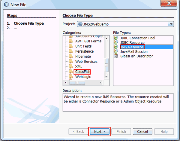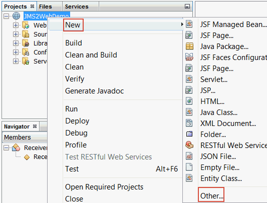 project is created in NetBeans. Creating the JMS Producer and Receiver Managed Beans