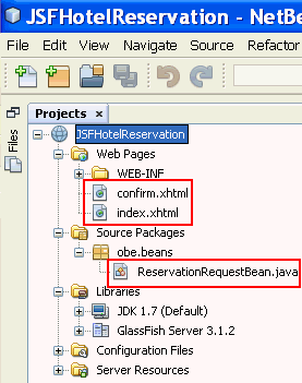 Start the NetBeans IDE, open the provided JSFHotelReservation project, and expand the Web Pages, Source Package and Libraries folders.