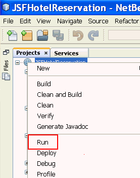 Back on the Projects tab, right-click on the JSFHotelApplication