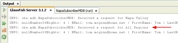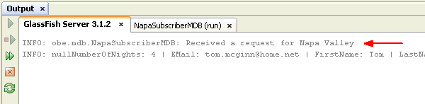 In the Output Window, under the GlassFish Server tab, you will see that the NapaSubscriberMDB received a request for reservations in Napa Valley