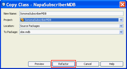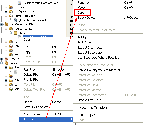 Perform a Refactor Copy on the NapaSubscriberMDB.java file in the NapaSubscriberMDB project. Right-click on the file and select Refactor then Copy.