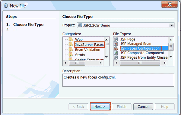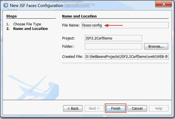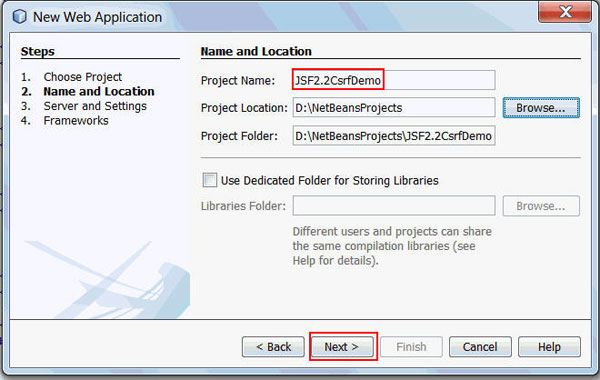 On the Name and Location page, enter JSF2.2CsrfDemo
