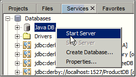 - If the Java DB server is not running: In NetBeans, click the Services tab, expand Databases, right-click Java DB, and select Start Server.