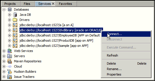 Right-click the jdbc:derby://localhost:1527/dvdlibrary[oracle