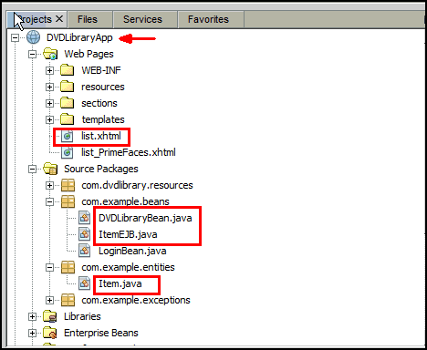 List.xhtml: This is the JSF page.DVDLibraryBean.java: This is the Contexts and Dependency Injection (CDI) named bean for theListfacelet.ItemEJB.java: This is an Enterprise JavaBeans (EJB; stateless bean) whose instance is injected inDVDLibraryBean.Item.java: This entity class represents theItemtable. TheItemBeanclass uses it during persistent operations.