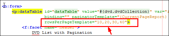 <p:dataTable>component and apply its pagination attributes in a JSF page