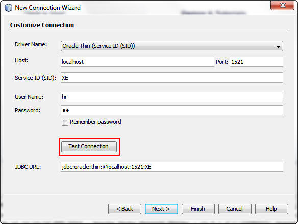 Customize Connectionダイアログ・ボックスに、HRデータベース接続の事前移入されたデータが表示されます。
