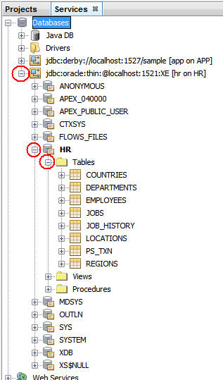 Servicesウィンドウで、新しい接続、「HR」、「Tables」の順に開きます。