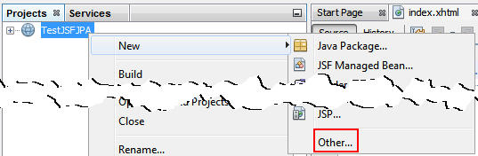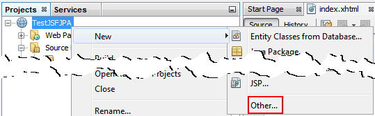 Projectsウィンドウの「TestJSFJPA」を右クリックして、「New」→「Other」を選択します。