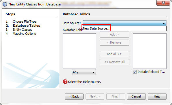 Database Tables画面で、Data Sourceリストから「New Data Source」を選択し、Create Data Sourceダイアログ・ボックスを表示します。