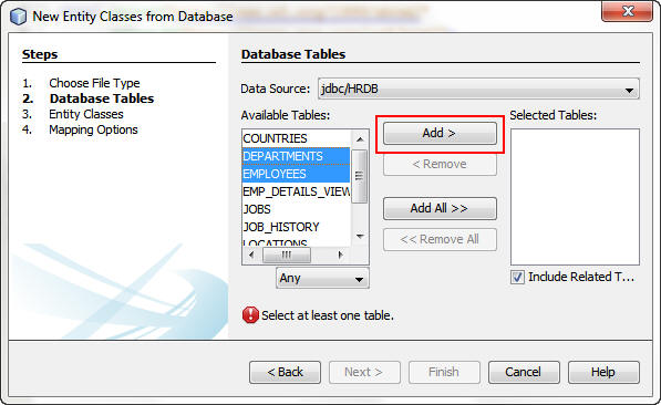 a. [Ctrl]キーを押して、Available Tablesから「DEPARTMENTS」と「EMPLOYEES」を選択します。