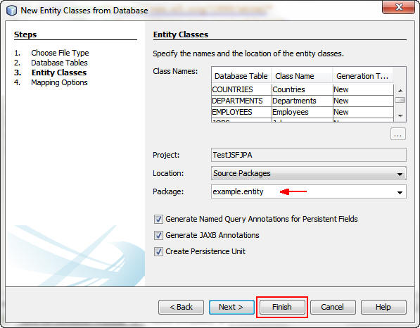 Entity Classes画面で、パッケージ名としてexample.entityと入力し、「Finish」をクリックします。