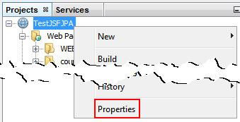 NetBeansで「TestJSFJPA」を右クリックし、「Properties」を選択します。