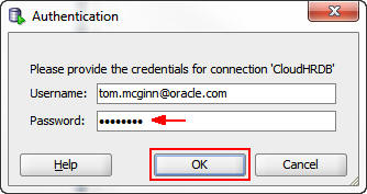 接続のコンテンツを見ようとするとAuthenticationダイアログ・ボックスが表示され、Oracle Database Cloud Serviceでの認証が必要となります。
