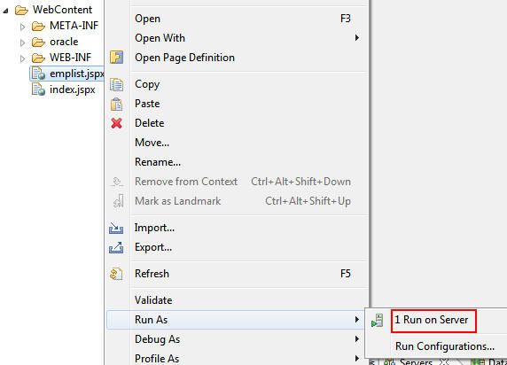Project Explorerで、「emplist.jspx」を右クリックして「Run As」→「Run On Server」を選択します。