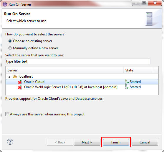 Run On Serverダイアログ・ボックスで、「Oracle Cloud」を選択して「Finish」をクリックします。