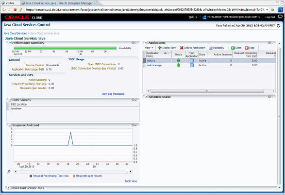 The Java Cloud Services Control console opens in another web browser window.