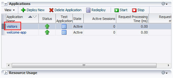 The Applications section shows the list of applications that are deployed to Oracle Java Cloud Service.