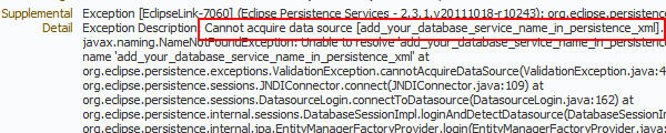 The Supplemental Detail section includes the complete stack trace. The critical information is the first line, which indicates that the data source is not set properly in the persistence.xml file.