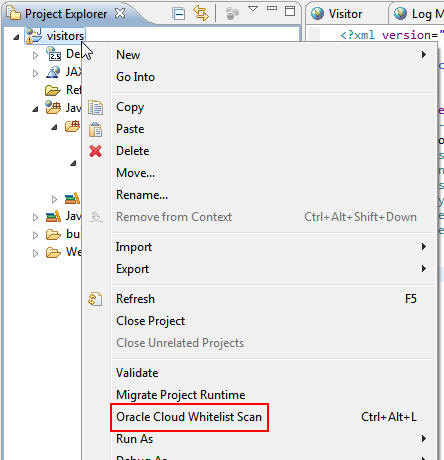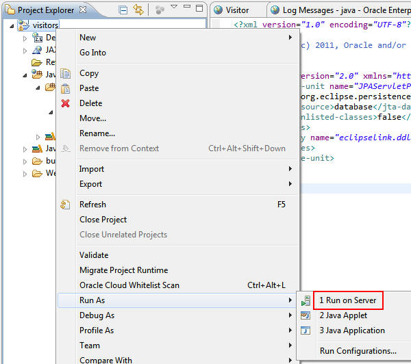 Right-click the visitors project and select Oracle