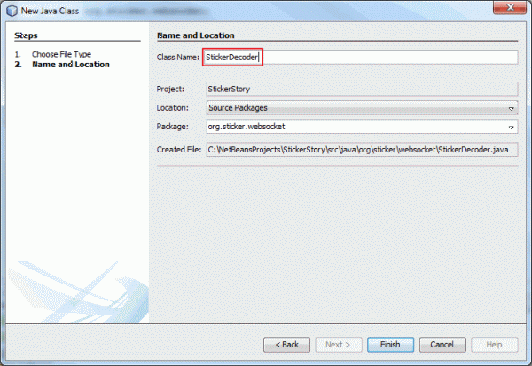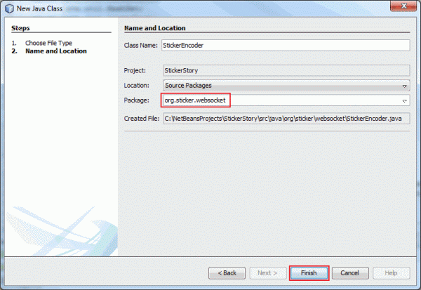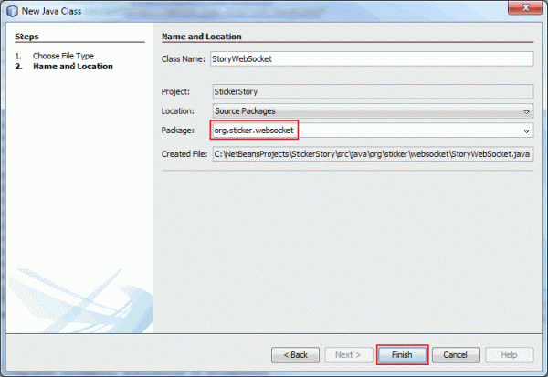 Enter org.sticker.websocket as the package and click Finish.