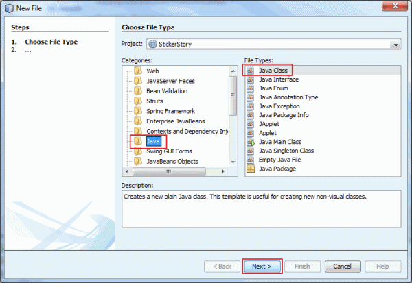 Select Java from Categories and Java Class from File Types and click Next.