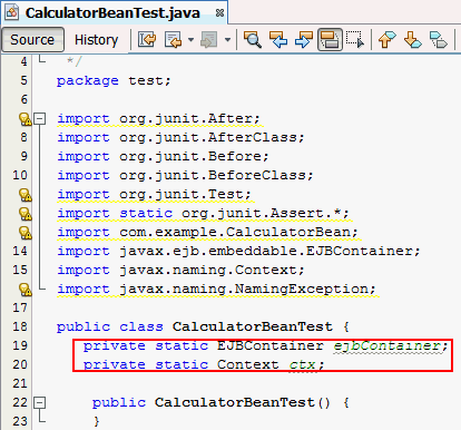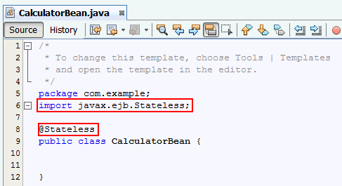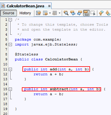 Double-click CalculatorBean.java in the Source Packages node to open in the code editor.