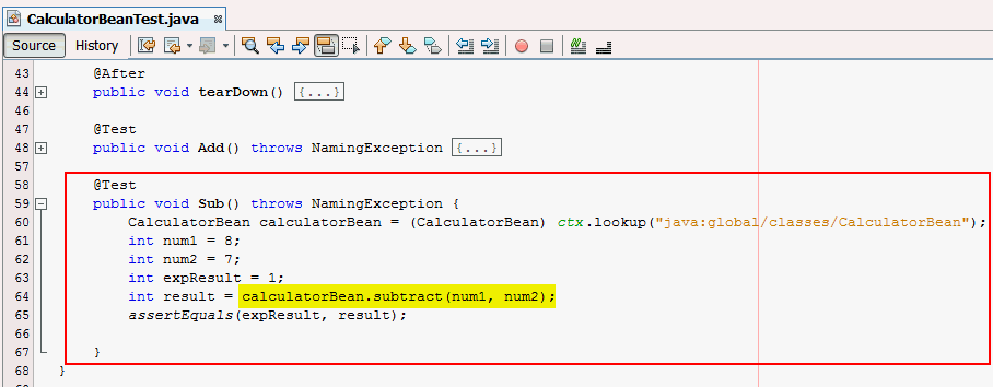 performs a unit test of the add method of CalculatorBean,Create a test method, Sub.