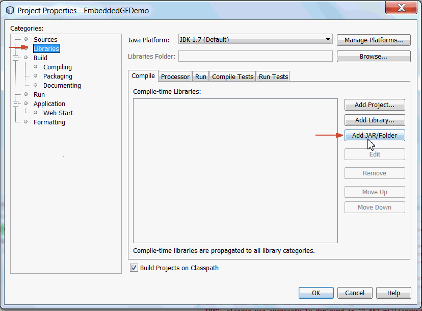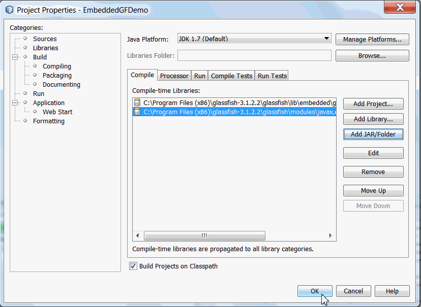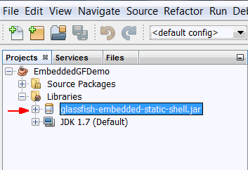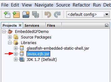 Add the GlassFish embedded EJB container to the classpath of the EmbeddedGFDemo project by completing the following steps