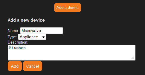 style.cssfile.body { font-family: Arial, Helvetica, sans-serif; font-size: 80%; background-color: #1f1f1f; } #wrapper { width: 960px; margin: auto; text-align: left; color: #d9d9d9; } p { text-align: left; } .button { display: inline; color: #fff; background-color: #f2791d; padding: 8px; margin: auto; border-radius: 8px; -moz-border-radius: 8px; -webkit-border-radius: 8px; box-shadow: none; border: none; } .button:hover { background-color: #ffb15e; } .button a, a:visited, a:hover, a:active { color: #fff; text-decoration: none; } #addDevice { text-align: center; width: 960px; margin: auto; margin-bottom: 10px; } #addDeviceForm { text-align: left; width: 400px; margin: auto; padding: 10px; } #addDeviceForm span { display: block; } #content { margin: auto; width: 960px; } .device { width: 180px; height: 110px; margin: 10px; padding: 16px; color: #fff; vertical-align: top; border-radius: 8px; -moz-border-radius: 8px; -webkit-border-radius: 8px; display: inline-block; } .device.off { background-color: #c8cccf; } .device span { display: block; } .deviceName { text-align: center; font-weight: bold; margin-bottom: 12px; } .removeDevice { margin-top: 12px; text-align: center; } .device.Appliance { background-color: #5eb85e; } .device.Appliance a:hover { color: #a1ed82; } .device.Electronics { background-color: #0f90d1; } .device.Electronics a:hover { color: #4badd1; } .device.Lights { background-color: #c2a00c; } .device.Lights a:hover { color: #fad232; } .device.Other { background-color: #db524d; } .device.Other a:hover { color: #ff907d; } .device a { text-decoration: none; } .device a:visited, a:active, a:hover { color: #fff; } .device a:hover { text-decoration: underline; } -