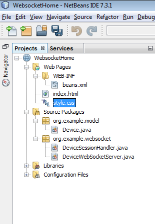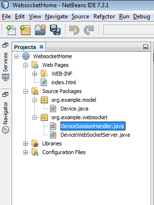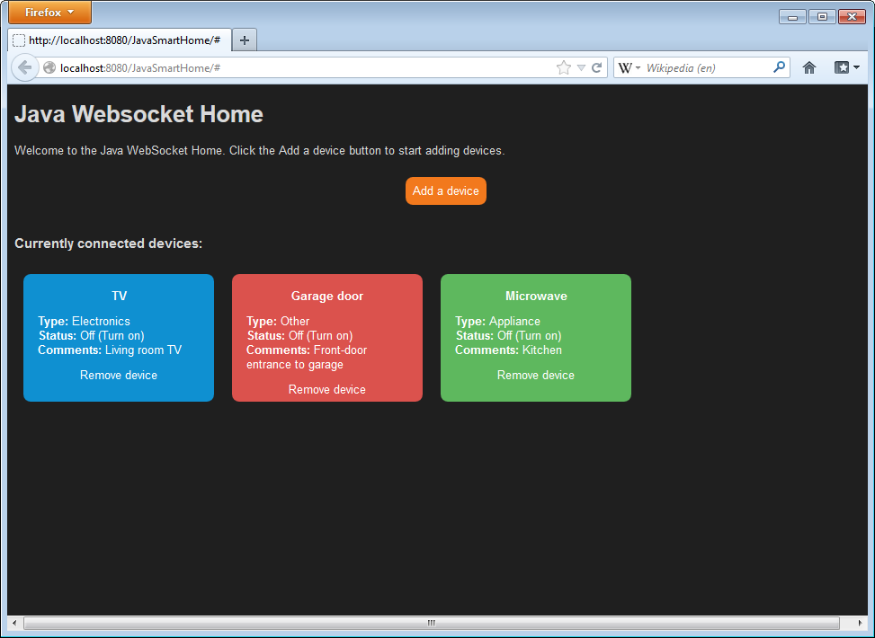 In this tutorial, you create Java WebSocket Home, a smart home control web application based on Java EE 7. Java WebSocket Home has a user interface for connecting and controlling fictitious devices from a web browser to a Java application. This application provides real-time updates to all clients that are connected to the Java WebSocket Home server.