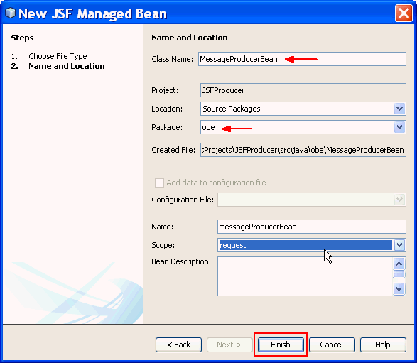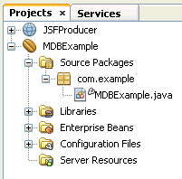 Specifically, you will define a Queue Destination and Connection Factory in NetBeans. After deploying the application once, you can use a feature in NetBeans to generate the code that uses the Connection Factory you specified to generate a Connection object. With the Connection object, the generated code creates a Session object, which is used to create a MessageProducer object to send the string entered on JSF page to the queue as a Message object.